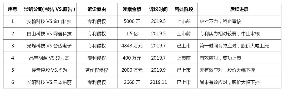 事实上,科创板已经成为知识产权诉讼的高发地。今年5月份以来针对科创板公司发生的知识产权诉讼已经有6起,详见表1。诉讼时间既有在上市前期也有已经成功上市的,诉讼金额多数在千万以上甚至过亿。从后续进展来看,如果不能及时有效应对,往往会由此引发上市受阻或股价大幅下挫等严重后果。